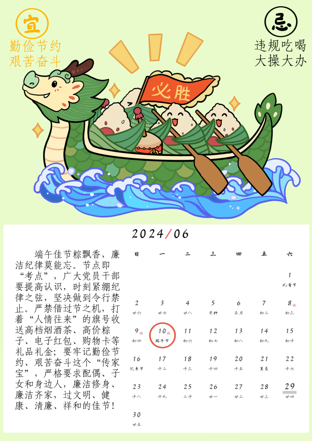 端午佳节粽飘香,廉洁纪律莫能忘。节点即“考点”,广大党员干部要提高认识,时刻紧绷纪律之弦,坚决做到令行禁止。