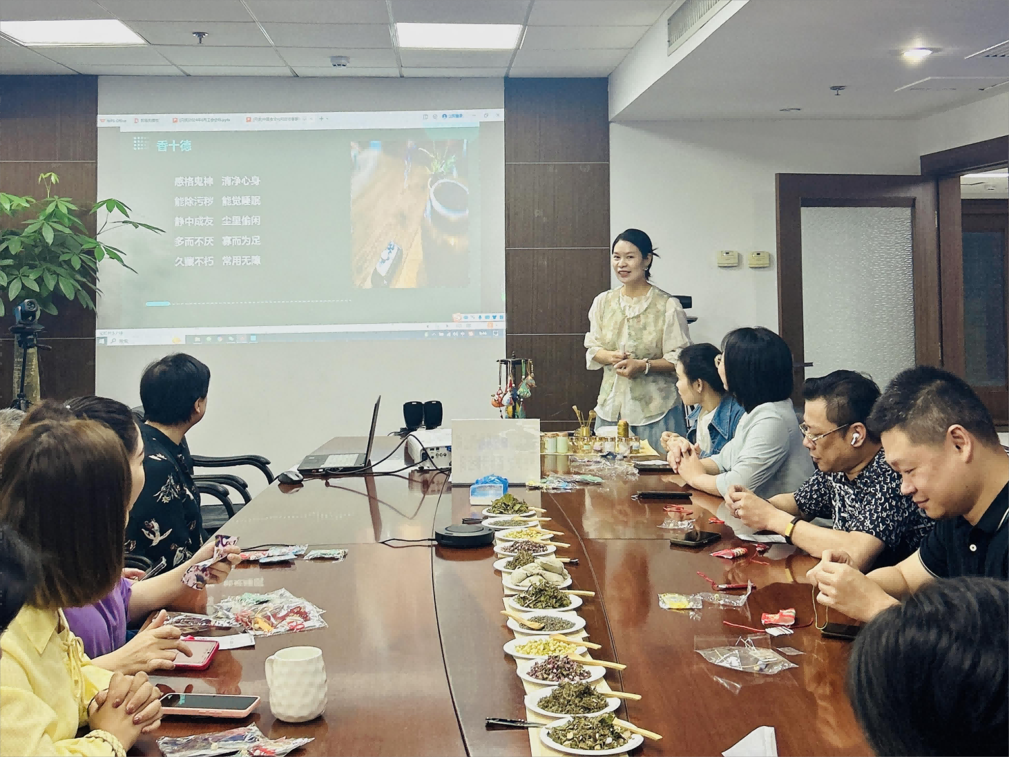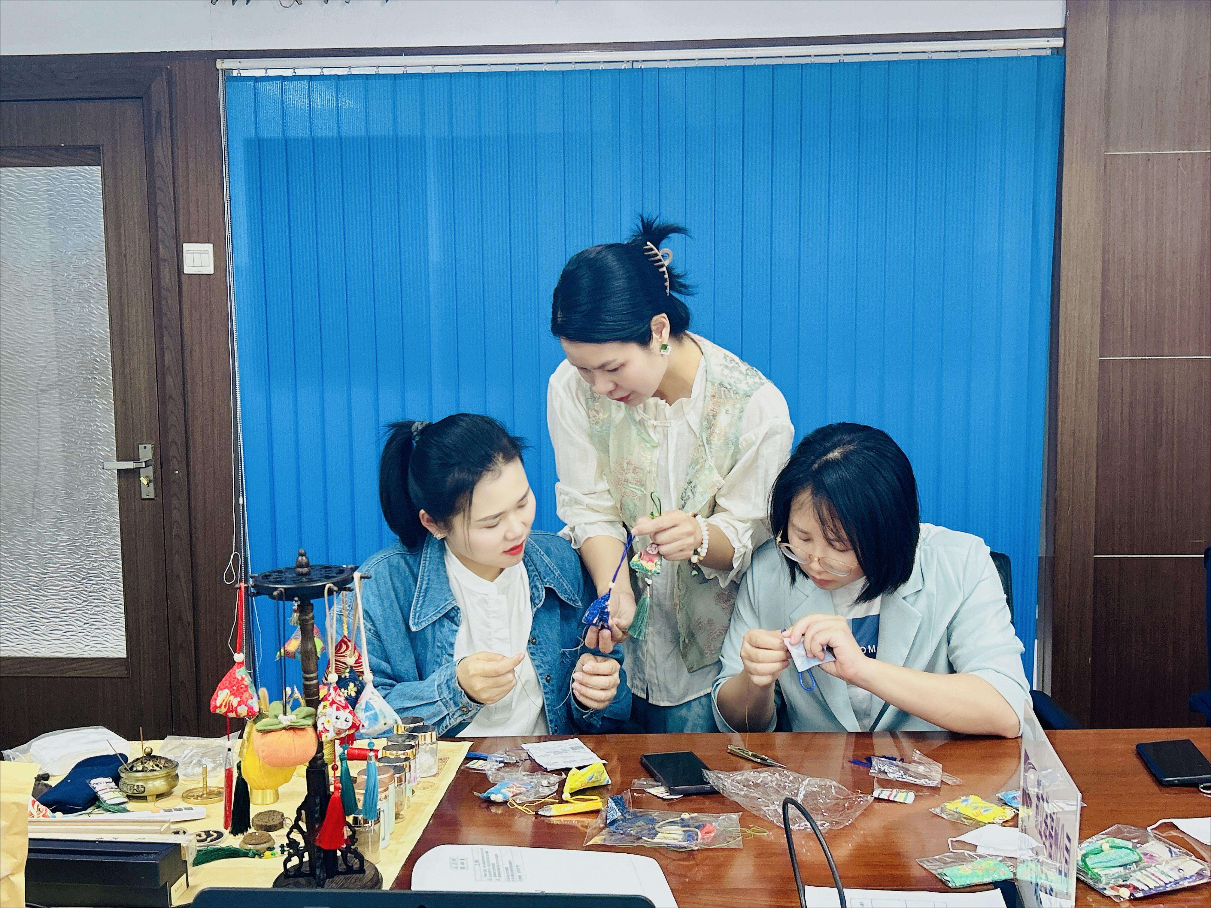 活动邀请到了国家二级职业指导师、中国香文化传播者(香艺师)陈兰香老师,陈老师详细介绍了端午节的起源、习俗及屈原的故事,从香囊来历、香料品类、佩香囊传统文化入手,结合节气养生知识进行授课。随后,在老师的耐心指导下,大家齐齐动手,默契配合,从穿针、引线、打结、裁剪、挂珠串儿、装香料到缝合,一个个芳香扑鼻的香囊在灵巧的双手中诞生,现场弥漫着清新的艾草香,“以艾香思廉心”,正传递着阵阵廉洁清风。