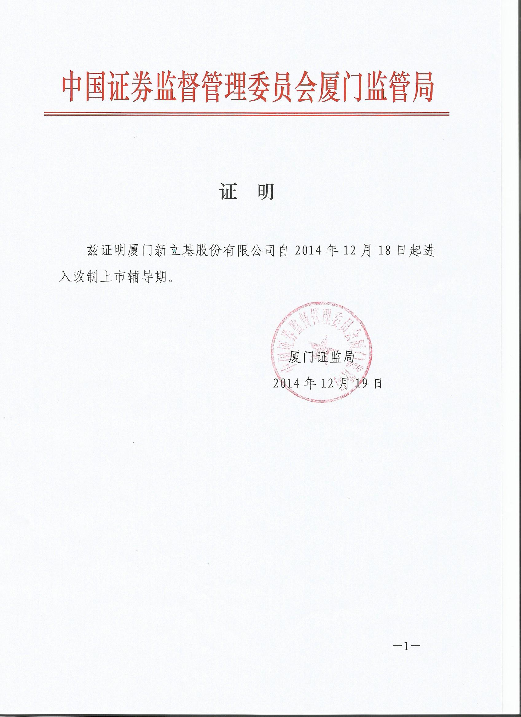 经厦门证监局批准,开云官方网页版官网股份有限公司自2014年12月18日起进入改制上市辅导期。