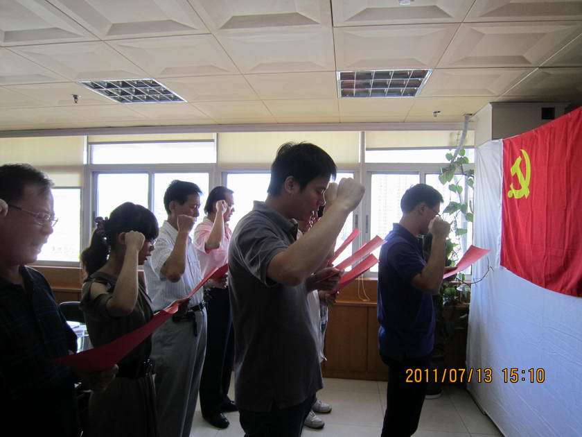 首先举行了庄重的新党员入党宣誓、老党员重温入党誓词仪式。在连续三年获得投资公司“优秀党员”称号的连晓琪同志带领下,新老党员面对鲜红的党旗,一起举起右手,一句一句地高声念着入党誓词。不仅新老党员增强了党员意识,而且参加会议的积极分子也受到了一次深刻的党性教育。